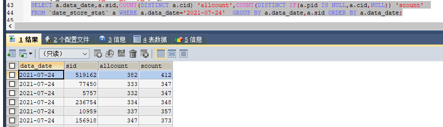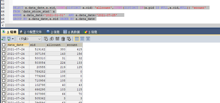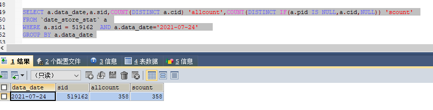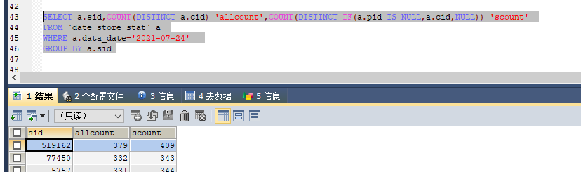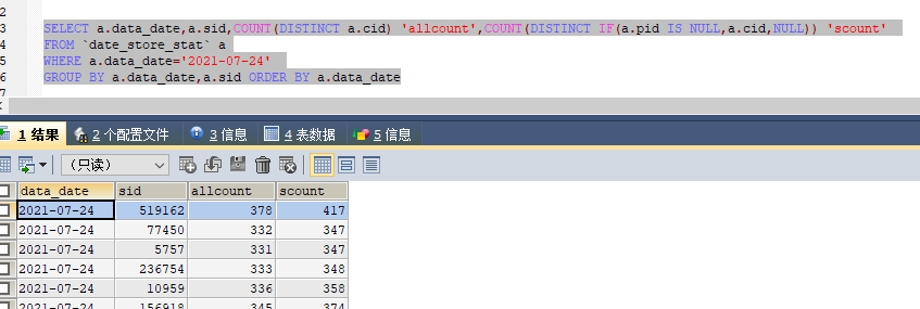 SELECT a.data_date,a.sid,COUNT(DISTINCT a.cid) ‘allcount’,COUNT(DISTINCT IF(a.pid IS NULL,a.cid,NULL)) ‘scount’