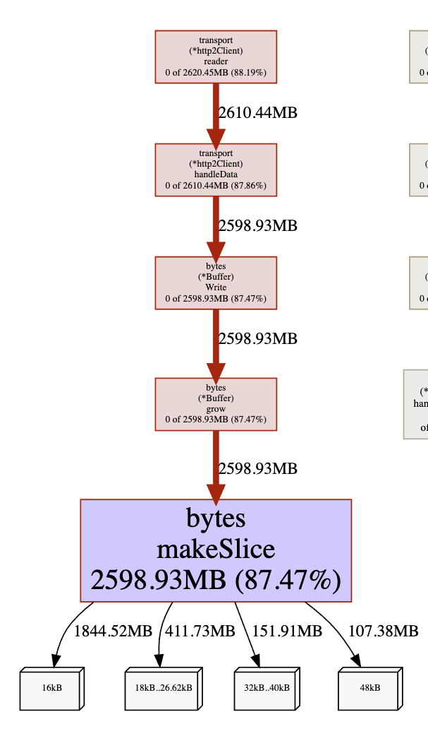 我们有尝试分析heap,发现内存占用最大的是 http2Client 调用的 bytes.makeSlice,因我们团队不熟悉go语言,找了些资料暂时还不理解。