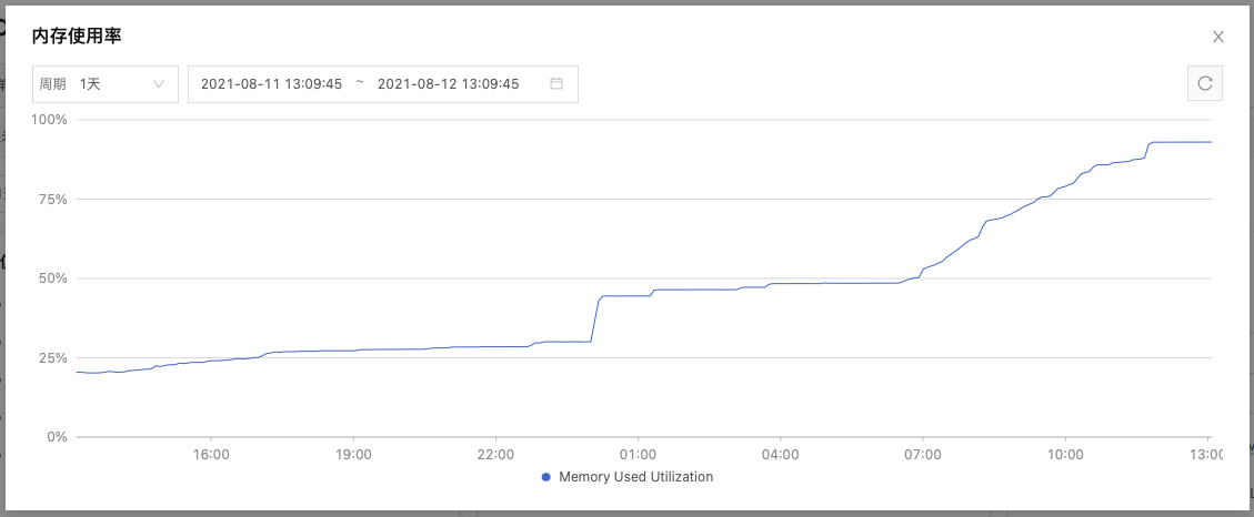 内存突增大部分发生在7-9点, 这倒也是我们业务高峰, 但我们分析了很久也没发现异常SQL。其他时间也在缓慢逐渐上升。