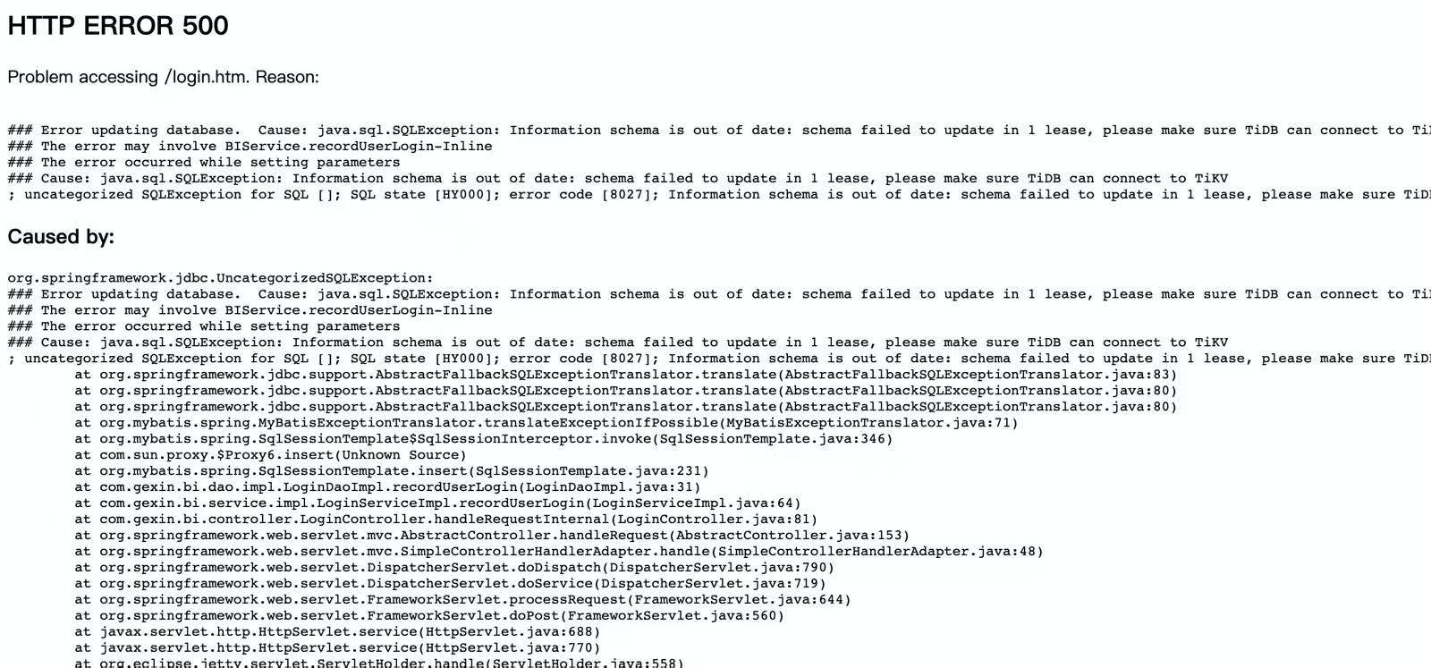 [2021/08/18 14:39:33.539 +08:00] [WARN] [session.go:503] [“commit failed”] [“finished txn”=“Txn{state=invalid}”] [error=“[domain:8027]Information schema is out of date: schema failed to update in 1 lease, please make sure TiDB can connect to TiKV”]