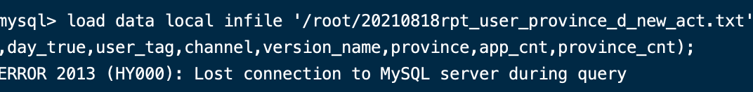 0] [mem_max=“0 Bytes (0 Bytes)”] [sql="load data local infile ‘/app/azkaban_app/b2d_geyan/geyan_umclogin_day_report_new_mid_hour.txt’ into table geyan_umclogin_hour_report_new\
