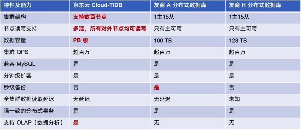 除了 TiDB 之外,市面上还有一些其他的分布式数据库,我们在当初选型的时候,也做了一些对比。从集群规模来看,TiDB 可以支持数百个节点,而其他的分布式数据库大都是 1 主 15 从,共支持 16 个节点,从节点规模上来说就差了一个数量级。从读写的扩展上看,TiDB 是一个多活架构,其所有对外提供服务的 TiDB 节点都是可以读可以写的,都是对等的,而其他产品多数只有主节点可以写,从节点只能提供读的能力,写还是和以前 MySQL 一样受限于单机能力,没法得到提升。从数据容量上来看,TiDB 可以达到 PB 级的数据量,而其他数据库都是在 100 TB 左右。除此之外,TiDB 支持实时数据分析,而其他的数据库不具备这个能力。TiDB 的备份效率会稍低一些,希望 TiDB 今后在这方面有更多的提升。