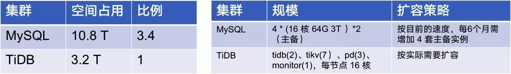 除此之外,迁移到 TiDB 还给了我们一个意外的惊喜, 我们做了一个评估, 如果按两年的周期计算,TiDB 的使用成本仅为 MySQL 的 37% 。为什么这么说?因为 TiDB 对数据的压缩率非常好,这是当时测试的结果,在 MySQL 里的数据占到 10.8 T,迁移到 TiDB 之后只有 3.2 T,而且这 3.2 T 还是三副本的总数据量。所以,MySQL 与 TiDB 的空间使用比是 3.4:1。