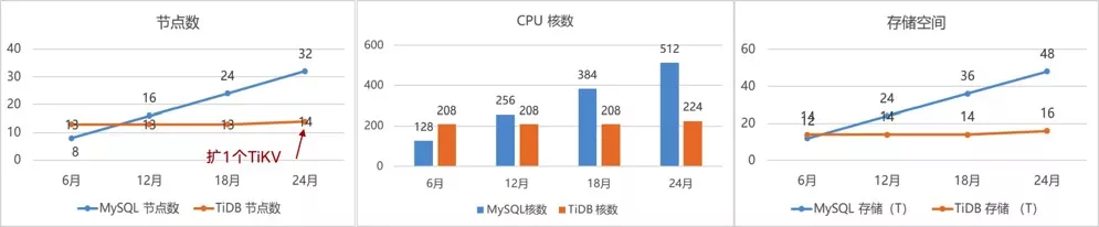 原先的架构是一个四分片的 MySQL 集群,按照目前数据增长的速度,大概是每六个月就要进行扩容,每次要扩四套主备实例。TiDB 按实际需要扩容就行了。可以看到在第 24 个月的时候,MySQL 有 32 个节点,TiDB 只有 14 个节点,使用的 CPU 核数 MySQL 是 512 个,而 TiDB 只要 200 多个,不到 MySQL 的一半。在存储空间上,TiDB 更是只有 MySQL 的 1/3。所以说,TiDB 带给我们的惊喜就是帮助我们整个业务部门极大地降低了 IT 的投入成本。