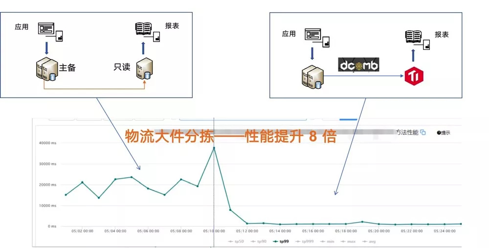 第二个案例是京东物流大件分拣的业务系统。以前这个系统的一些实时看板和核心报表都是跑在 MySQL 上。随着数据量增加,而且 SQL 比较复杂,报表和看板的性能比较低,用户的体验不是特别好。当时我们也尝试过分库分表的方式,但是这种方式对代码侵入性比较大,架构需要大幅调整,风险比较高。