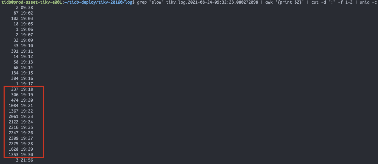 根据tikv.log日志信息,当时每分钟的slow-query日志输出达到1k多甚至2k: