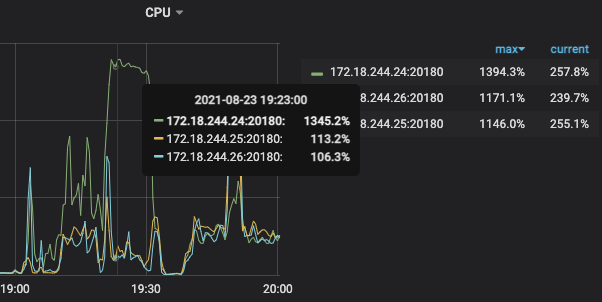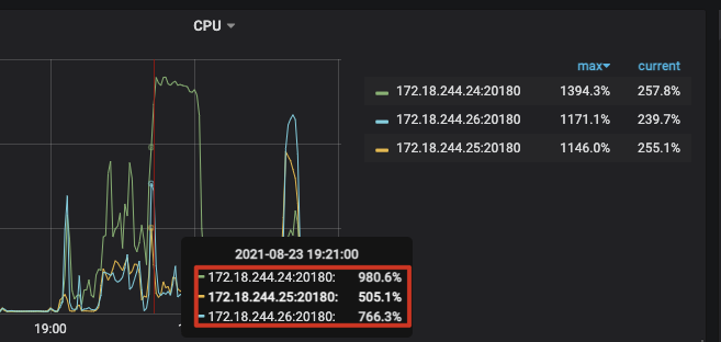 现象:在19:20更新资产时,三台TiKV负载都比较高(分别为5/7/9,虽然有些不均匀但还可以接受),但是批量更新JOB结束后,有一台TiKV节点负载开始飙升(16C64G机器,用了13C,剩下两个节点只用了1、2个核),期间落到该节点的查询都一直被卡死,没有响应。