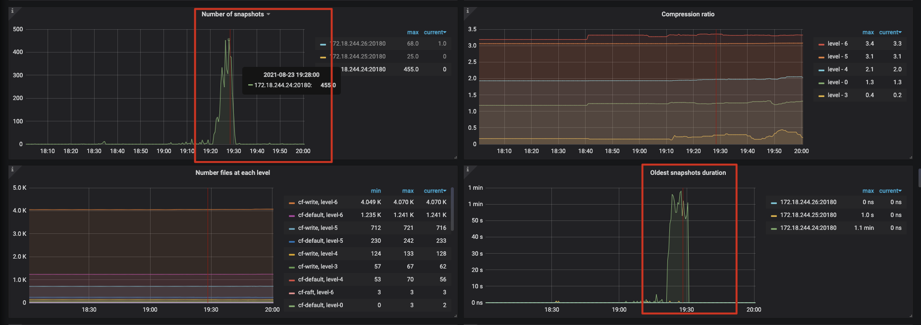 不过TiKV-Detail ==> RocksDB-kv ==> Number of Snapshots指标,正常时候应该是0的,故障节点达到了400多,不清楚是否有关联