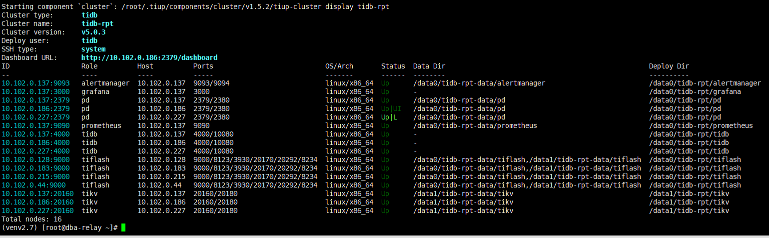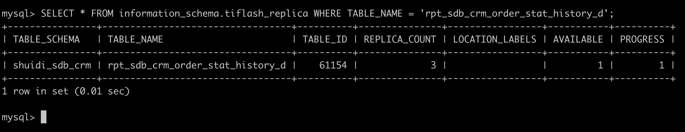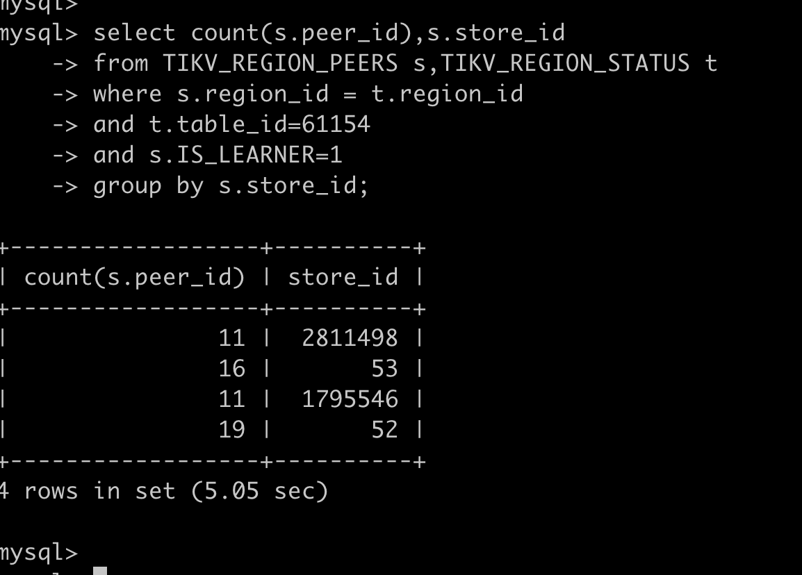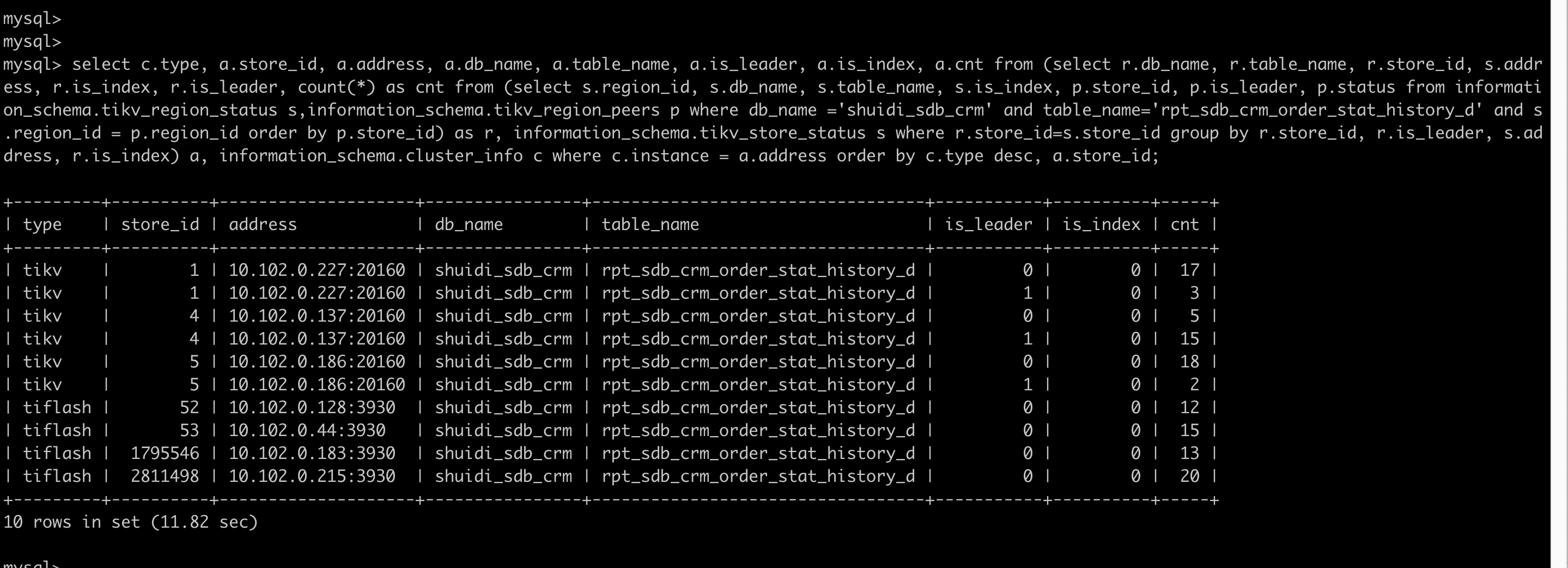 select c.type, a.store_id, a.address, a.db_name, a.table_name, a.is_leader, a.is_index, a.cnt from (select r.db_name, r.table_name, r.store_id, s.address, r.is_index, r.is_leader, count(*) as cnt from (select s.region_id, s.db_name, s.table_name, s.is_index, p.store_id, p.is_leader, p.status from information_schema.tikv_region_status s,information_schema.tikv_region_peers p where db_name =‘shuidi_sdb_crm’ and table_name=‘rpt_sdb_crm_order_stat_history_d’ and s.region_id = p.region_id order by p.store_id) as r, information_schema.tikv_store_status s where r.store_id=s.store_id group by r.store_id, r.is_leader, s.address, r.is_index) a, information_schema.cluster_info c where c.instance = a.address order by c.type desc, a.store_id;