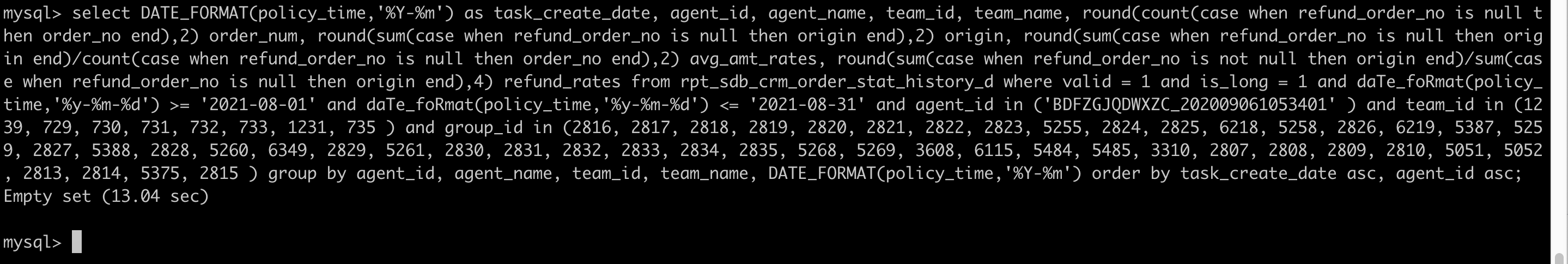 select DATE_FORMAT(policy_time,’%Y-%m’) as task_create_date, agent_id, agent_name, team_id, team_name, round(count(case when refund_order_no is null then order_no end),2) order_num, round(sum(case when refund_order_no is null then origin end),2) origin, round(sum(case when refund_order_no is null then origin end)/count(case when refund_order_no is null then order_no end),2) avg_amt_rates, round(sum(case when refund_order_no is not null then origin end)/sum(case when refund_order_no is null then origin end),4) refund_rates from rpt_sdb_crm_order_stat_history_d where valid = 1 and is_long = 1 and daTe_foRmat(policy_time,’%y-%m-%d’) >= ‘2021-08-01’ and daTe_foRmat(policy_time,’%y-%m-%d’) <= ‘2021-08-31’ and agent_id in (‘BDFZGJQDWXZC_202009061053401’ ) and team_id in (1239, 729, 730, 731, 732, 733, 1231, 735 ) and group_id in (2816, 2817, 2818, 2819, 2820, 2821, 2822, 2823, 5255, 2824, 2825, 6218, 5258, 2826, 6219, 5387, 5259, 2827, 5388, 2828, 5260, 6349, 2829, 5261, 2830, 2831, 2832, 2833, 2834, 2835, 5268, 5269, 3608, 6115, 5484, 5485, 3310, 2807, 2808, 2809, 2810, 5051, 5052, 2813, 2814, 5375, 2815 ) group by agent_id, agent_name, team_id, team_name, DATE_FORMAT(policy_time,’%Y-%m’) order by task_create_date asc, agent_id asc;