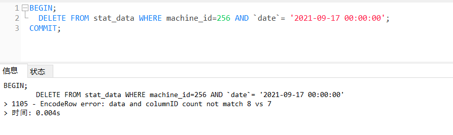 [2021/09/23 11:46:26.718 +08:00] [INFO] [conn.go:995] [“command dispatched failed”] [conn=196291] [connInfo=“id:196291, addr:192.168.6.191:57850 status:1, collation:utf8_general_ci,”] [command=Query] [status=“inTxn:1, autocommit:0”] [sql=“DELETE FROM history_data WHERE ( ( machine_id = 375 )\ \ \ \ and ( tertime = ‘2021-09-23 11:45:00.0’\ \ \ \ or tertime = ‘2021-09-23 11:40:00.0’ ) )”] [txn_mode=PESSIMISTIC] [err=“EncodeRow error: data and columnID count not match 56 vs 55\ngithub.com/pingcap/tidb/tablecodec.EncodeOldRow\ \t/home/jenkins/agent/workspace/optimization-build-tidb-linux-amd/go/src/github.com/pingcap/tidb/tablecodec/tablecodec.go:305\ github.com/pingcap/tidb/table/tables.(*TableCommon).addDeleteBinlog\ \t/home/jenkins/agent/workspace/optimization-build-tidb-linux-amd/go/src/github.com/pingcap/tidb/table/tables/tables.go:1146\ngithub.com/pingcap/tidb/table/tables.(*TableCommon).RemoveRecord\ \t/home/jenkins/agent/workspace/optimization-build-tidb-linux-amd/go/src/github.com/pingcap/tidb/table/tables/tables.go:1091\ngithub.com/pingcap/tidb/table/tables.(*partitionedTable).RemoveRecord\ \t/home/jenkins/agent/workspace/optimization-build-tidb-linux-amd/go/src/github.com/pingcap/tidb/table/tables/partition.go:1161\ngithub.com/pingcap/tidb/executor.(*DeleteExec).removeRow\ \t/home/jenkins/agent/workspace/optimization-build-tidb-linux-amd/go/src/github.com/pingcap/tidb/executor/delete.go:207\ngithub.com/pingcap/tidb/executor.(*DeleteExec).deleteOneRow\ \t/home/jenkins/agent/workspace/optimization-build-tidb-linux-amd/go/src/github.com/pingcap/tidb/executor/delete.go:62\ngithub.com/pingcap/tidb/executor.(*DeleteExec).deleteSingleTableByChunk\ \t/home/jenkins/agent/workspace/optimization-build-tidb-linux-amd/go/src/github.com/pingcap/tidb/executor/delete.go:112\ngithub.com/pingcap/tidb/executor.(*DeleteExec).Next\ \t/home/jenkins/agent/workspace/optimization-build-tidb-linux-amd/go/src/github.com/pingcap/tidb/executor/delete.go:50\ngithub.com/pingcap/tidb/executor.Next\ \t/home/jenkins/agent/workspace/optimization-build-tidb-linux-amd/go/src/github.com/pingcap/tidb/executor/executor.go:285\ github.com/pingcap/tidb/executor.(*ExecStmt).handleNoDelayExecutor\ \t/home/jenkins/agent/workspace/optimization-build-tidb-linux-amd/go/src/github.com/pingcap/tidb/executor/adapter.go:590\ngithub.com/pingcap/tidb/executor.(*ExecStmt).handlePessimisticDML\ \t/home/jenkins/agent/workspace/optimization-build-tidb-linux-amd/go/src/github.com/pingcap/tidb/executor/adapter.go:609\ngithub.com/pingcap/tidb/executor.(*ExecStmt).handleNoDelay\ \t/home/jenkins/agent/workspace/optimization-build-tidb-linux-amd/go/src/github.com/pingcap/tidb/executor/adapter.go:469\ngithub.com/pingcap/tidb/executor.(*ExecStmt).Exec\ \t/home/jenkins/agent/workspace/optimization-build-tidb-linux-amd/go/src/github.com/pingcap/tidb/executor/adapter.go:420\ngithub.com/pingcap/tidb/session.runStmt\ \t/home/jenkins/agent/workspace/optimization-build-tidb-linux-amd/go/src/github.com/pingcap/tidb/session/session.go:1786\ github.com/pingcap/tidb/session.(*session).ExecuteStmt\ \t/home/jenkins/agent/workspace/optimization-build-tidb-linux-amd/go/src/github.com/pingcap/tidb/session/session.go:1680\ngithub.com/pingcap/tidb/server.(*TiDBContext).ExecuteStmt\ \t/home/jenkins/agent/workspace/optimization-build-tidb-linux-amd/go/src/github.com/pingcap/tidb/server/driver_tidb.go:218\ngithub.com/pingcap/tidb/server.(*clientConn).handleStmt\ \t/home/jenkins/agent/workspace/optimization-build-tidb-linux-amd/go/src/github.com/pingcap/tidb/server/conn.go:1818\ngithub.com/pingcap/tidb/server.(*clientConn).handleQuery\ \t/home/jenkins/agent/workspace/optimization-build-tidb-linux-amd/go/src/github.com/pingcap/tidb/server/conn.go:1690\ngithub.com/pingcap/tidb/server.(*clientConn).dispatch\ \t/home/jenkins/agent/workspace/optimization-build-tidb-linux-amd/go/src/github.com/pingcap/tidb/server/conn.go:1215\ngithub.com/pingcap/tidb/server.(*clientConn).Run\ \t/home/jenkins/agent/workspace/optimization-build-tidb-linux-amd/go/src/github.com/pingcap/tidb/server/conn.go:978\ngithub.com/pingcap/tidb/server.(*Server).onConn\ \t/home/jenkins/agent/workspace/optimization-build-tidb-linux-amd/go/src/github.com/pingcap/tidb/server/server.go:501\ runtime.goexit\ \t/usr/local/go/src/runtime/asm_amd64.s:1371”]