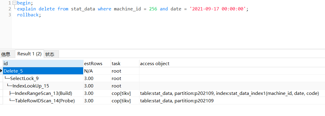 explain delete from stat_data where machine_id = 256 and date = ‘2021-09-17 00:00:00’