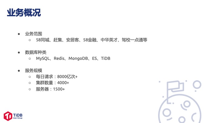 首先,我给大家介绍一下我们集团的业务概况。我们的业务范围包含 58 同城、赶集、安居客、58 金融、中华英才、驾校一点通等公司。我们使用的数据库有 MySQL、Redis、MongoDB、ES、TiDB等,大概每天的访问情况在 8000 亿次左右,集群数量 4000+,物理服务器数量 1500+。
