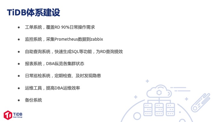 运维工具这一块我们做了这么几项:我们有集群拓扑的查询工具、集群的状态检查、慢日志分析、TiDB 监控、检查、自动部署、会话管理这些工具。