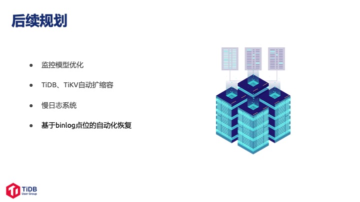 最后是一个实时的数据恢复,因为现在 TiDB 官方还没有比较理想的备份系统,我们只是简单用 Mydumper 去进行备份,之后我们也会用 Binlog 做实时备份,并且对两块的数据进行连动。