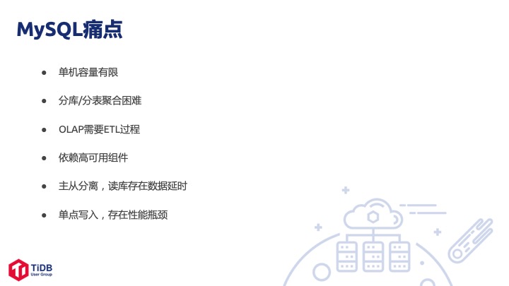 我们使用 TiDB 主要解决了几个 MySQL 遇到问题:
