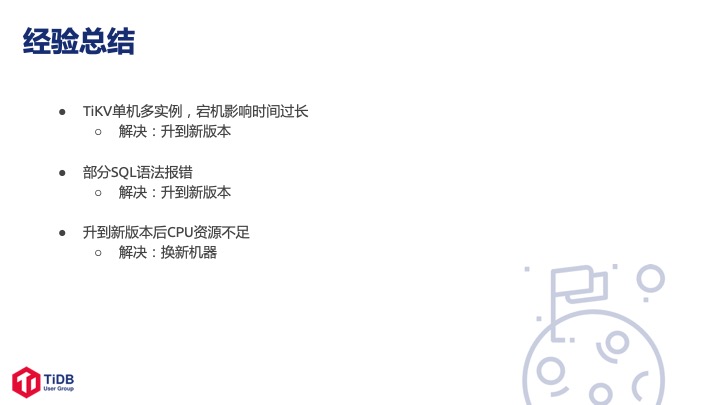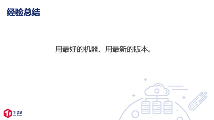 第三是我们之前选机器的时候,是根据磁盘去部署 TiKV 的,后来发现 CPU 资源不够用了,TiKV 越升级 CPU 使用越多。我们跟官方人员沟通后换了一个新的机型,增加了 CPU 的核数,然后减少了 TiKV 的数量。于是我们得出了一个结论:用最好的机器,用最新的版本,遇到问题都会解决的。
