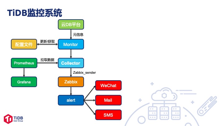 首先 Collector 会从云 DB 平台上拉取 TiDB 的硬件信息,再同步更新到 Ansible 的配置文件里比较一致性,如果不一致就进行更新。Collector 会到 Prometheus 上拉取监控数据,再把数据通过 Zabbix_sender 发送到 Zabbix 上,如果发现异常 Zabbix 后端会把告警发到微信、短信、邮件、IM 中。