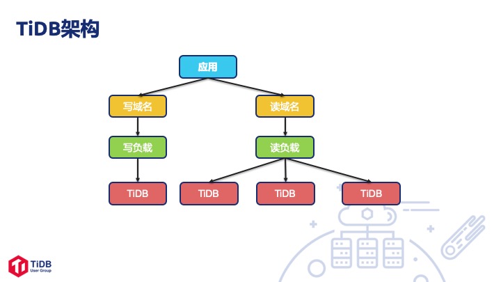 我们的 TiDB 架构比较简单,应用上首先是分读写域名,后端使用 Load Balance 。默认情况下我们一套集群上有 4 个 TiDB 节点,一个写三个读,如果写达到瓶颈的话,可以扩容 TiDB 节点。