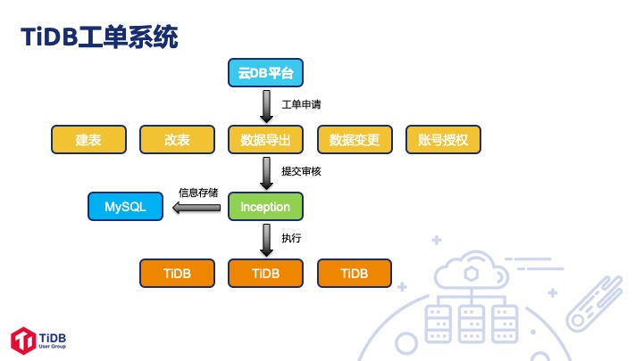 我们的 TiDB 工单系统支持建表工单、改表工单、数据导出、数据变更、帐号授权等工单,能够满足大部分 RD 的日常需求。后端走的是 Inception 校验,再提交到 TiDB 去执行,和 MySQL 的路径一样。但我们在 Inception 那里和 MySQL 的规则做了一些区分,比如说目前 TiDB 不支持自增主键,但 MySQL 要求必须有自增主键。
