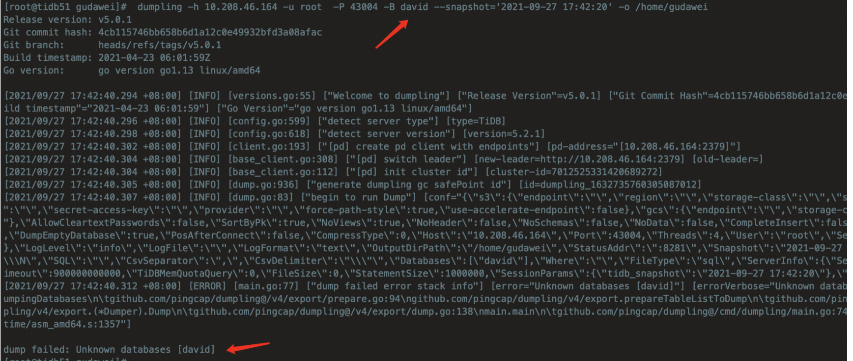 dumpling -h 10.208.46.164 -u root -P 43004 -B david --snapshot ‘2021-09-27 17:42:20’ -o /home/gudawei
