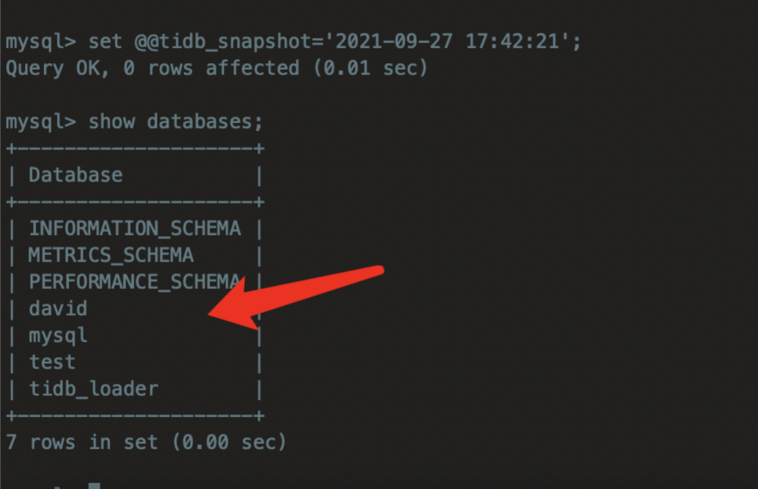 set @@tidb_snapshot=‘2021-09-27 17:42:21’;