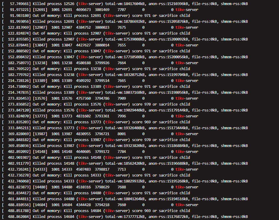@Lucien-卢西恩 日志显示是这两个ERROR,我从监控和top中看到的是 tikv启动,内存飙升,近100%后宕机重启,现在pending和down了太多region了,我们想赶紧先能正常起来