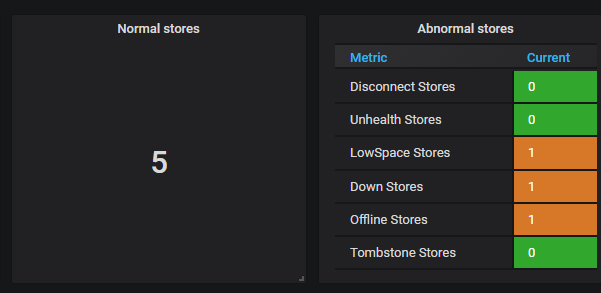 1.现在各节点上磁盘空间充足吗?最上面的监控面板中提示存在 lowspace 的 store ,有可能是磁盘空间不足导致调度一直没有完成,而且机器内存只有 16G ,低于标准部署要求,建议直接在一台新的机器上扩容 tikv 节点;