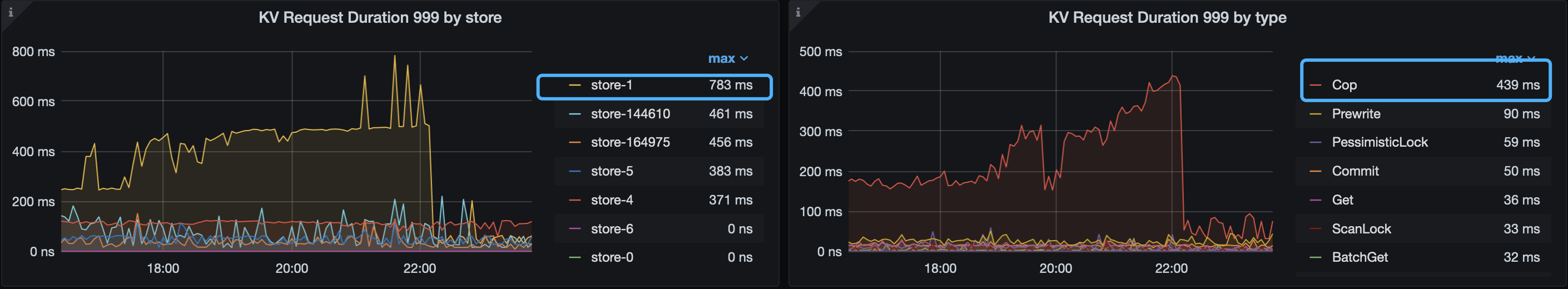 tidb 的监控显示,从 1 号的 18 点后,开始 store-1 的 duration 逐渐升高,并且到 22 点左右下降,于此同时 coprocessor 类型的请求 duration 也逐渐升高,且趋势较为吻合:
