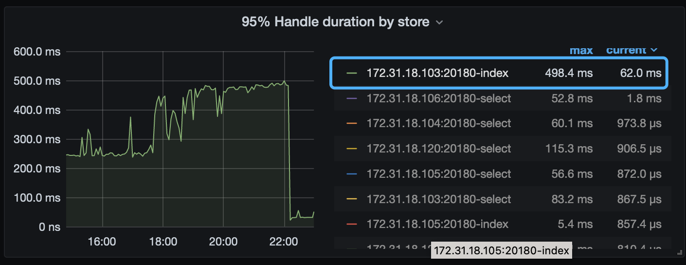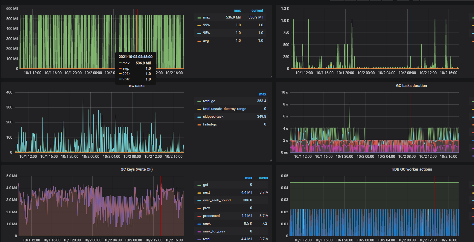 所以出现上面的问题,可以检查下 GC 或者 compaction 相关的监控,比如是否在 20 点前后进行了 compaction 操作,操作后,tidb duration 下降了。