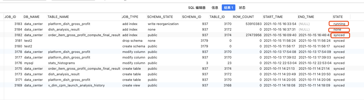 在sql查询里执行 ADMIN SHOW DDL JOBS 想知道STAT列里的字段含义