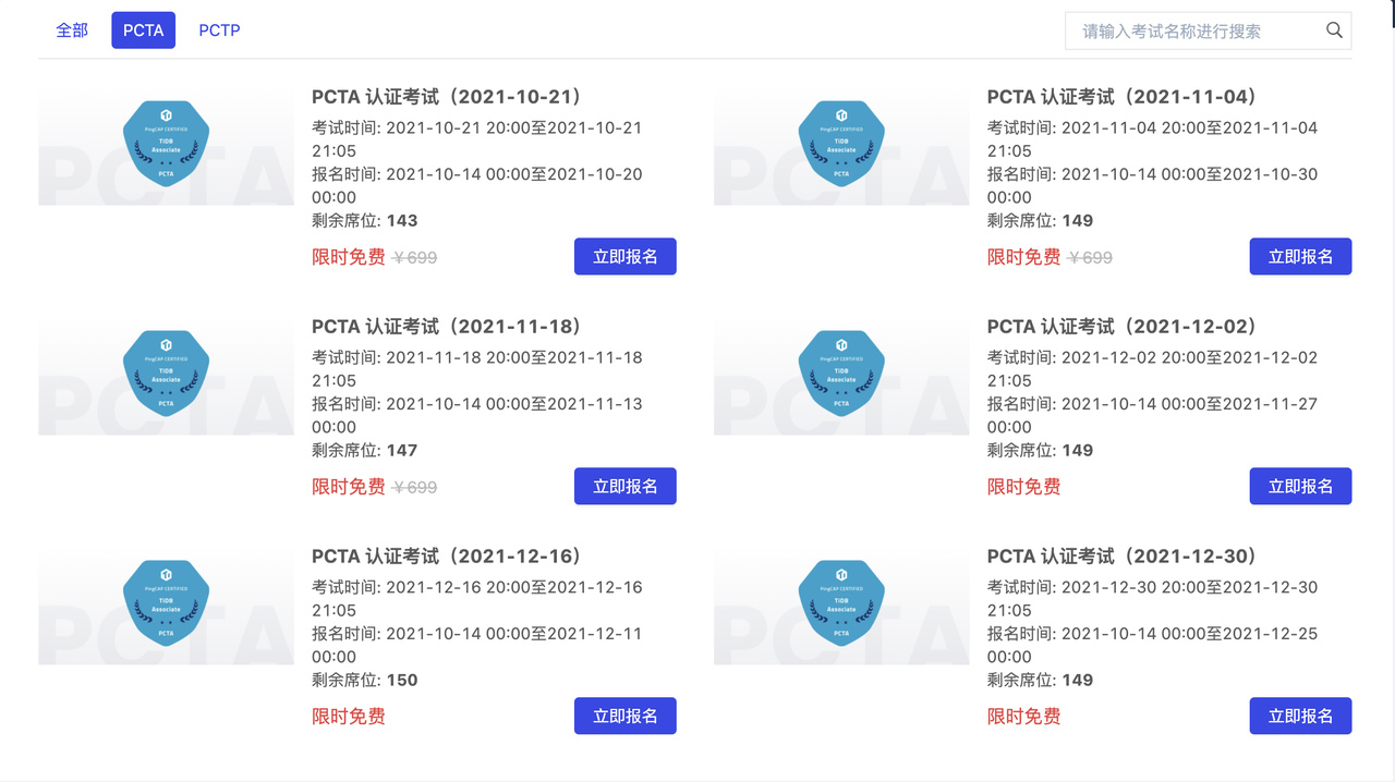 报名地址:https://learn.pingcap.com/learner/exam-market/list?category=PCTA