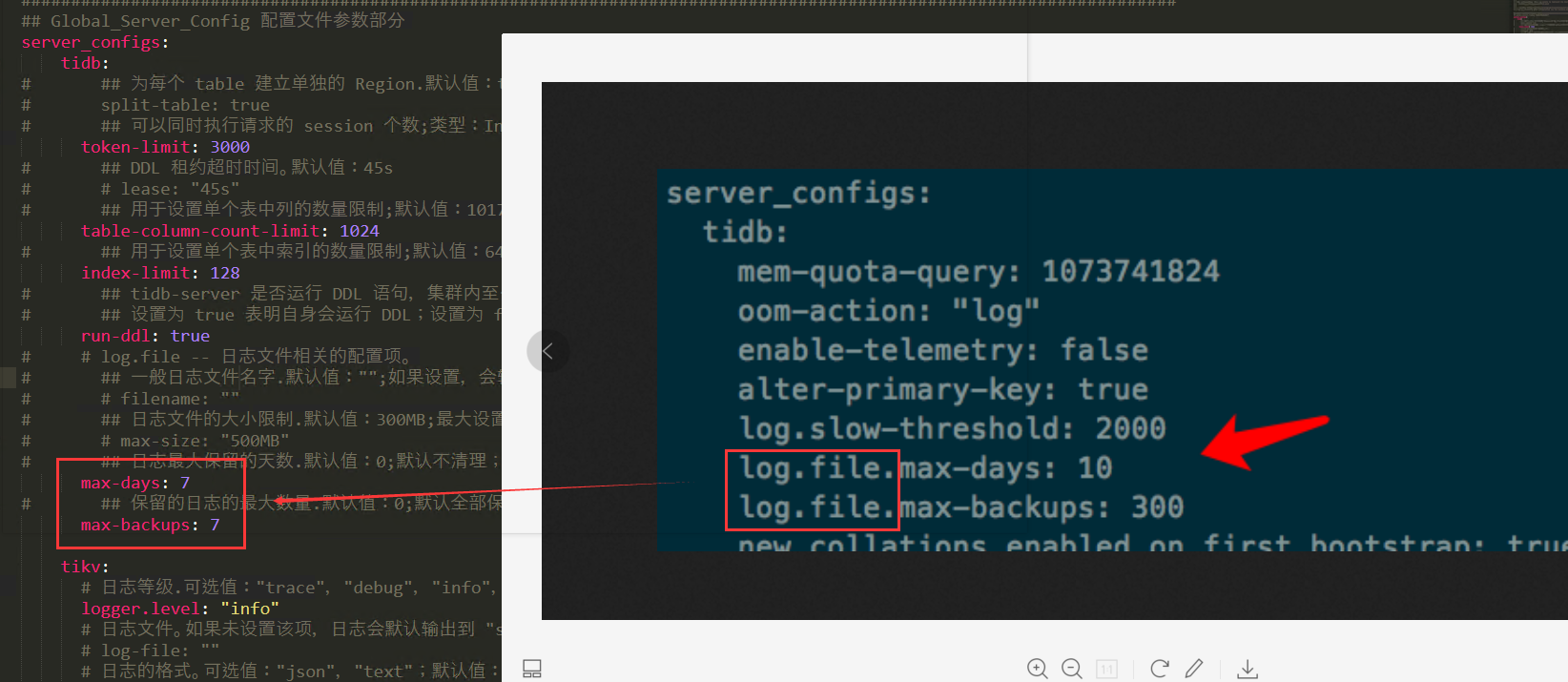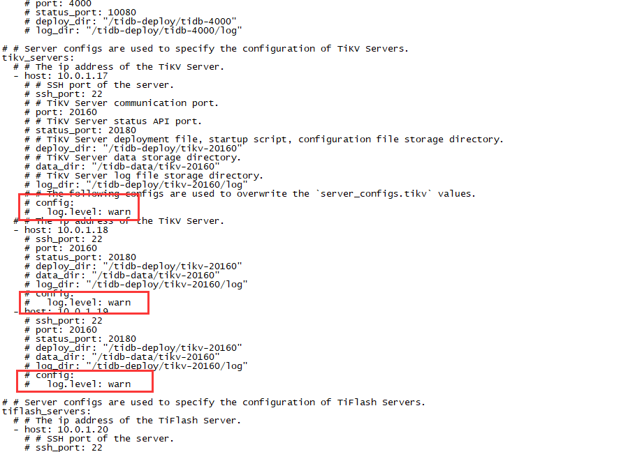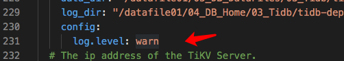 刚刚一个个对比参数测试部署了,检测出 server_configs 全局下 tikv 上参数 日志等级 是错误的: