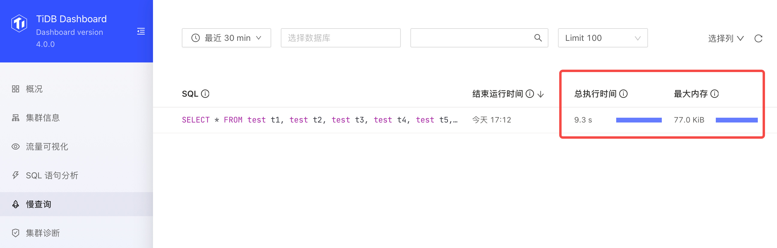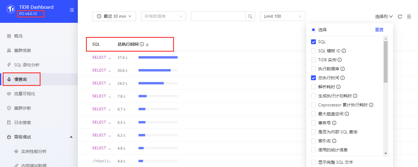 现在4.0.13的dashboard里慢查询界面只有两列,以前版本还有执行时间、内存等列。右侧的选择列里也没有这些列。是有人修改了配置,还是程序现在就只有两列了?