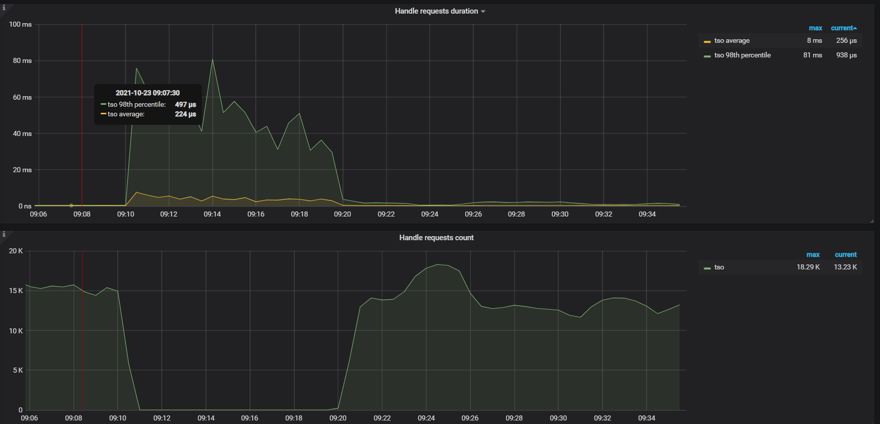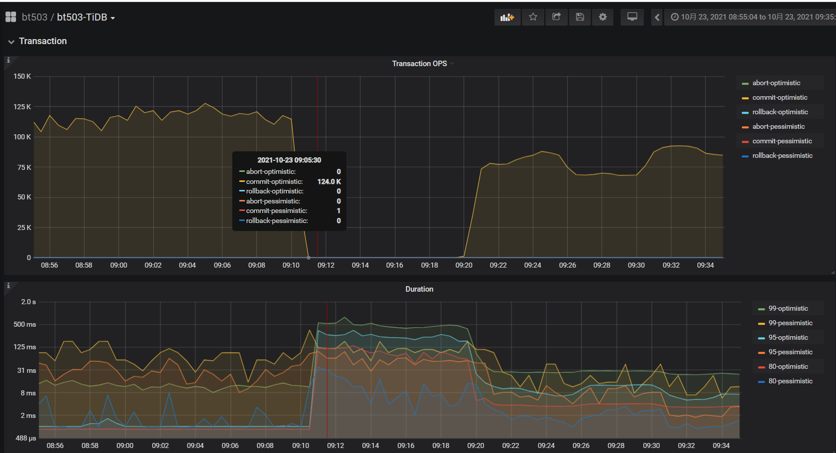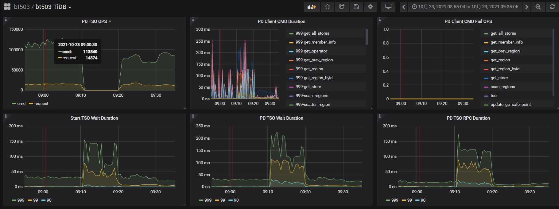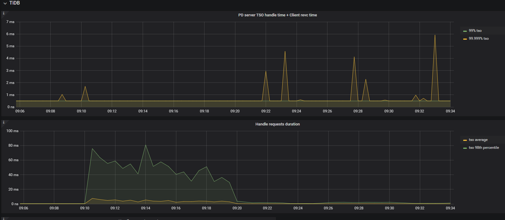从上面监控看 PD TSO RPC Duration 时间很高,需要再排查下监控面板中 PD → TiDB → 指标 PD server TSO handle time + Client revc time ,如果该指标值不高,那大概率是网络层面有问题,如果该值也非常高,需要排查下 PD 在处理 TSO 请求时耗时高的原因,可以参考下面这篇文档排查下: