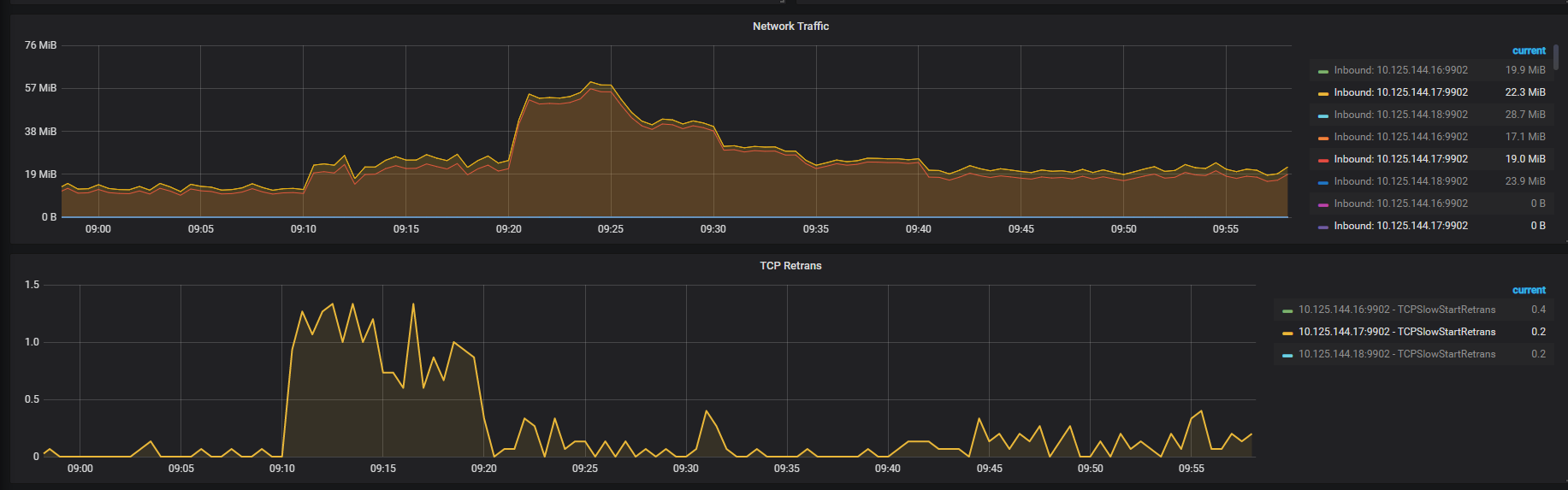 tiup cluster display 中显示的 pd leader 是 144.17 节点,上面网络监控面板是 144.18 ,这个无法反应出问题;另外看下监控面板 overview -> system info -> Network Traffic 和 TCP Retrans 指标在问题时间段的情况。