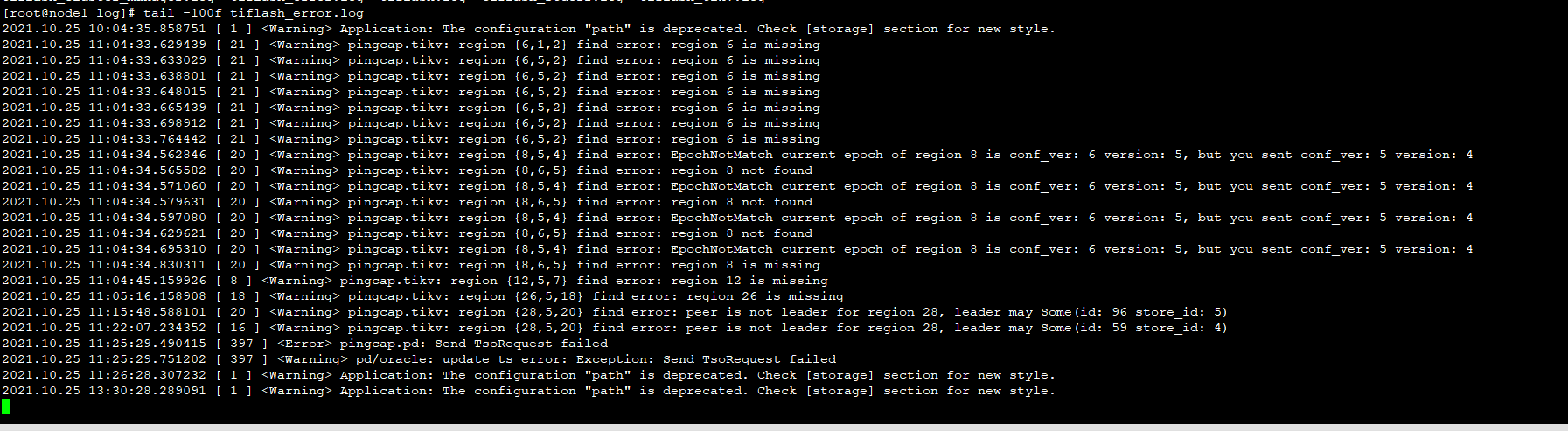 " Application: The configuration “path” is deprecated. Check [storage] section for new style." 是一个报错提示,可以看一下下面的报错,下面的报错是 ping tikv 的 region ,发现 region 状态是不正常的。可以通过 region id ,使用 pd-ctl 查看一下对应的 region 状态,region id 分别为 6、8、26、28 ,以及对应的 store id 的状态 store id 是 5,4 两个,可以看一下对应的 tikv log 日志,有没有在同时间有异常的报错。