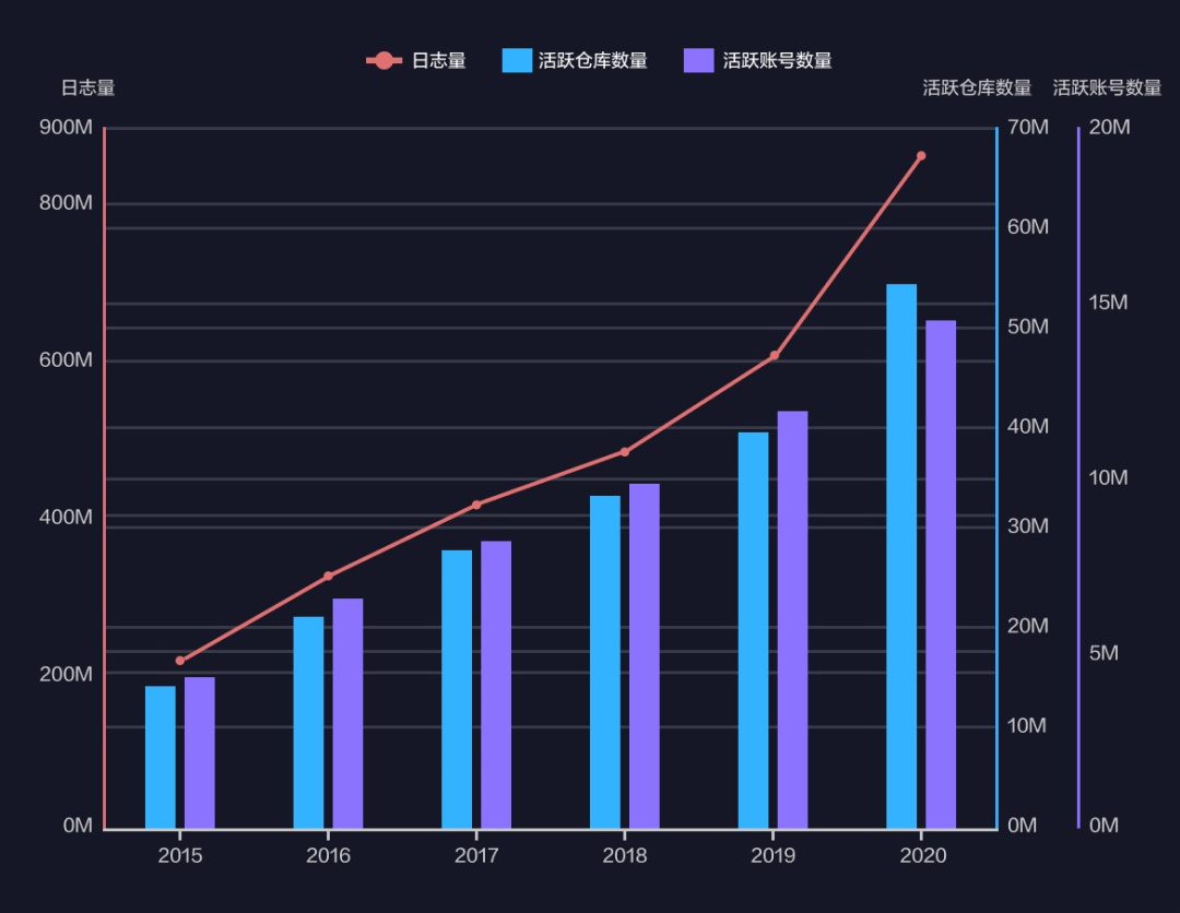 GitHub 2015 - 2020 年事件日志量、活跃仓库数量、活跃账号数量总体情况