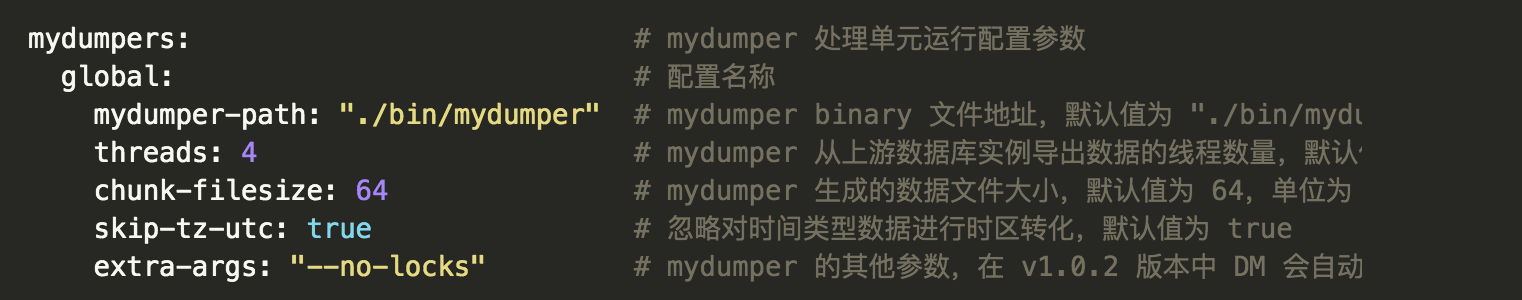 2)不推荐:在 dm 的 task 的配置文件中,mydumper 部分添加 --kill-long-queries 以及 --long-query-guard,示例如下: