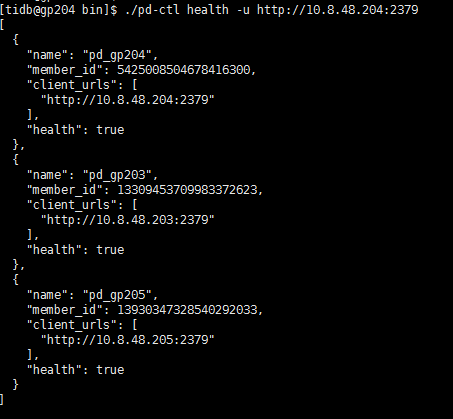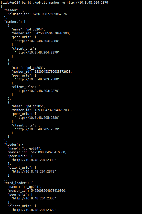 1、请使用 ./pd-ctl member -u http://10.8.48.204:2379 以及 ./pd-ctl health -u http://10.8.48.204:2379 看下当前 pd 的健康状态是否正常