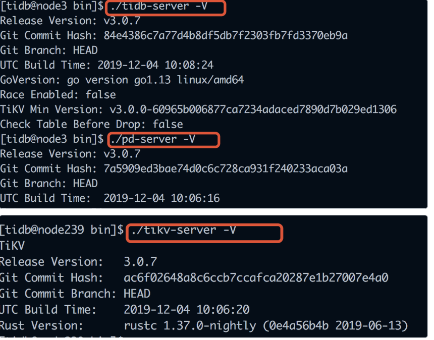 3、检查下 pd 节点,tikv 节点,以及 tidb 节点的版本分别是什么,分别在 tikv、pd、tidb 节点的 bin 目录下执行下述命令: