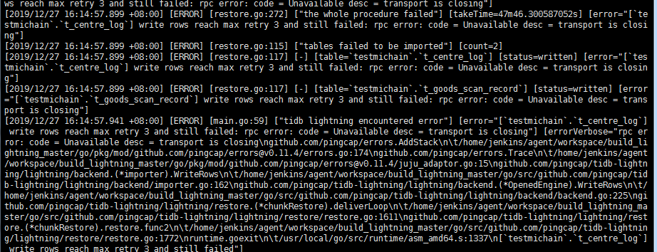 [2019/12/27 16:14:57.688 +08:00] [ERROR] [restore.go:1612] [“write to index engine failed”] [table=testmichain.t_centre_log] [engineNumber=0] [fileIndex=6] [path=/data1/deploy/mydumper/testmichain.t_centre_log.00007.sql:0] [task=deliver] [error="[testmichain.t_centre_log] write rows reach max retry 3 and still failed: rpc error: code = Unavailable desc = transport is closing"]