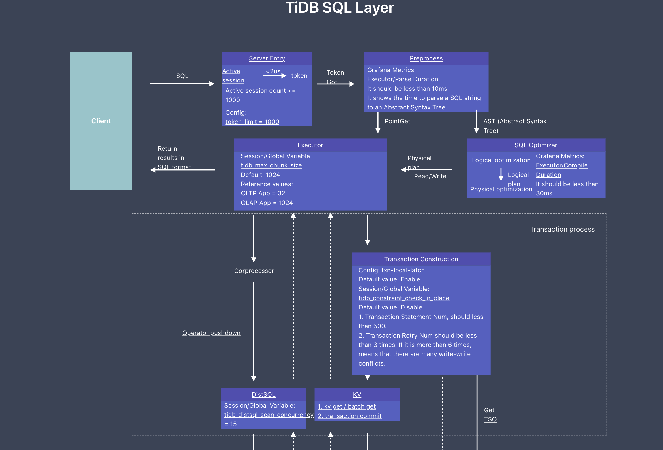 通过 TiDB Performance Map ,用户能从宏观上看到 TiDB 集群的交互,了解各个模块的细节,也能从对应的模块找到更多详细描述。并且能够看到各个组件内部详细的原理,以及各个参数是如何作用于哪个模块,这样用户就可以很轻松地从这张图上获取他所需要的信息。