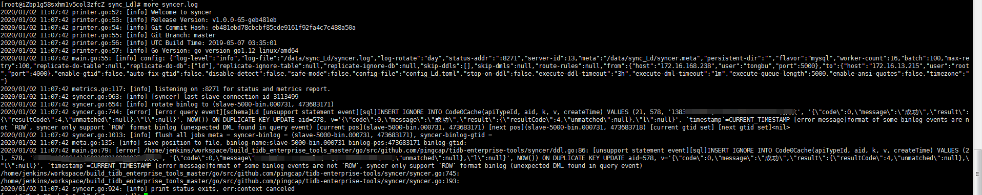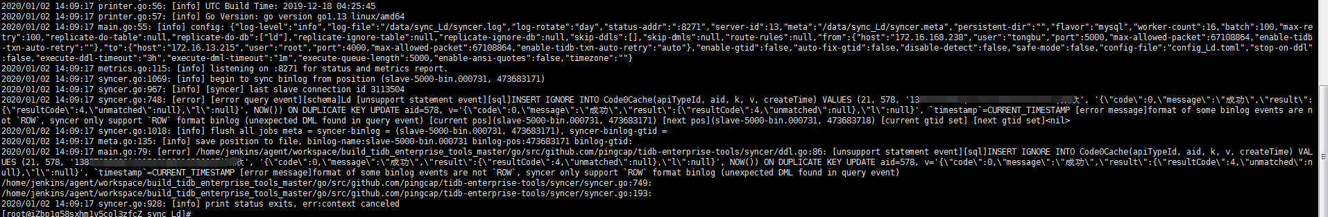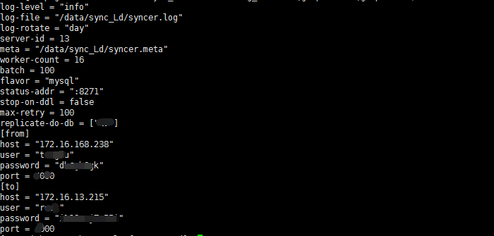 - 【问题描述】:数据从mariadb-10.2.16迁移到tidb中,全量同步使用mydumper\myloader已同步完成,由于环境数据量较小,使用syncer做同步,启动报错