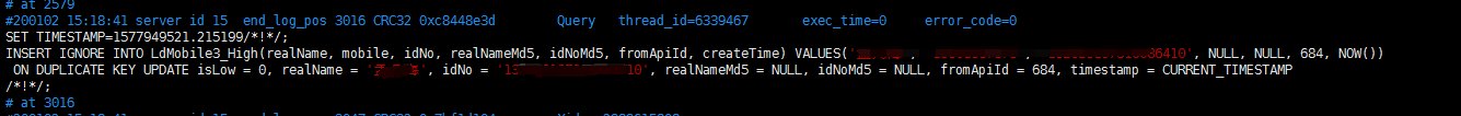 INSERT IGNORE INTO Code0Cache(apiTypeId, aid, k, v, createTime) VALUES (21, 578, ‘13837628606|411503198210220037|张欣’, ‘{“code”:0,“message”:“成功”,“result”: