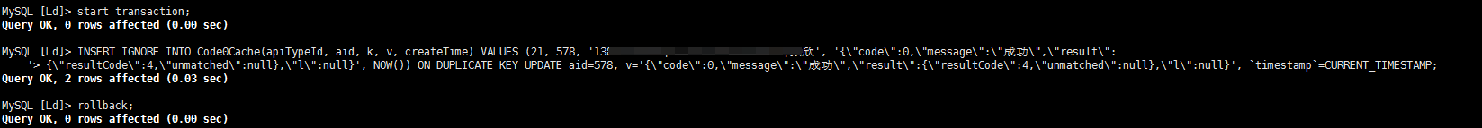 {“resultCode”:4,“unmatched”:null},“l”:null}’, NOW()) ON DUPLICATE KEY UPDATE aid=578, v=’{“code”:0,“message”:“成功”,“result”:{“resultCode”:4,“unmatched”:null},“l”:null}’, timestamp=CURRENT_TIMESTAMP