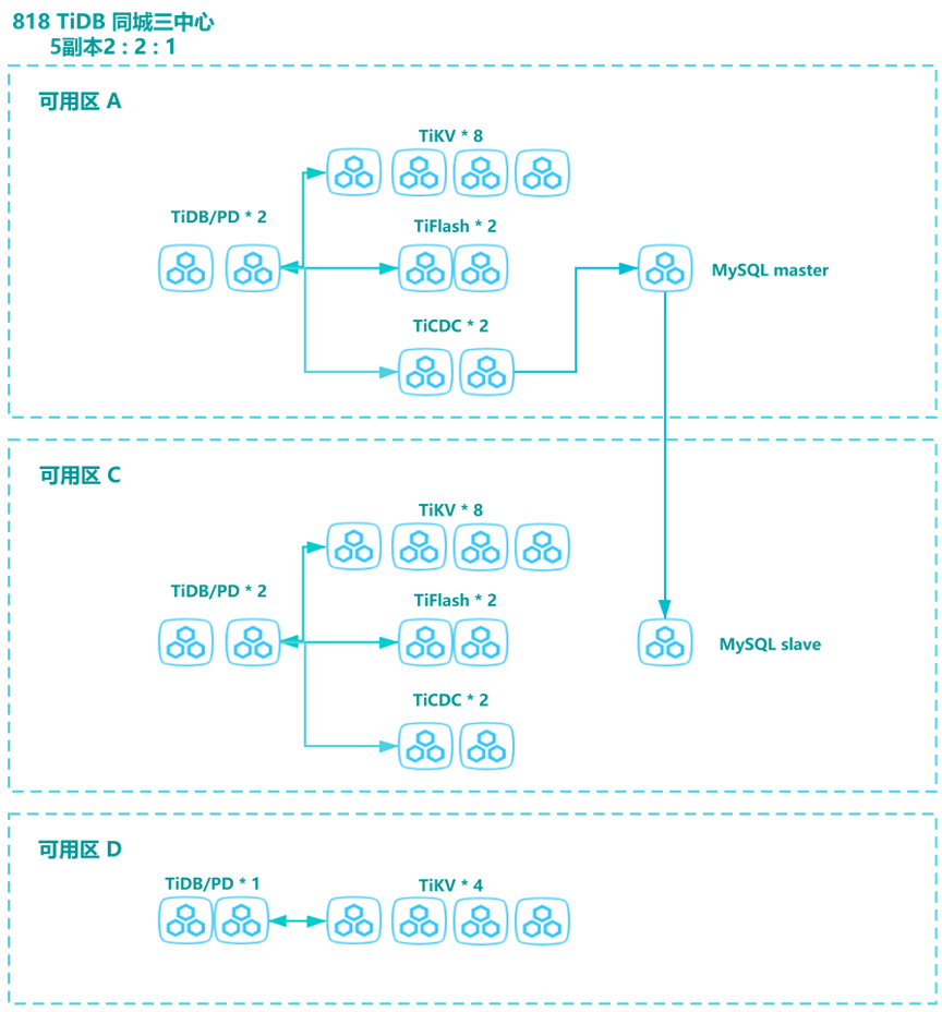 - MySQL 跨区部署主从,作为 TiDB 集群的应急、降级之用,实现业务容灾能力的提升。