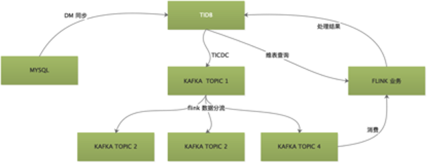 同时,TiDB 也作为容灾方案被应用在红包摇一摇业务中,避免由于业务流量暴涨引起 MySQL 不可用的情况。一旦发生不可用,业务方可以直接将数据库切换到 TiDB。TiDB 在整个业务中需要作为数据源、实时计算维表和实时计算结果存储引擎三个角色。TiDB 通过 TICDC 将数据实时推送到 KAFKA 中,为了保证 TICDC 稳定高效,易车为 TiDB 中的每个库创建了一个 TICDC任务,将数据实时推送到指定 KAFKA 中,然后 FLINK 负责将同一个 TOPIC 中的属于不同库表的数据进行解析,分流到库表对应的 TOPIC 中,提供给实时计算业务使用。实时计算任务消费 KAFKA 中的 TiDB 数据进行业务逻辑计算,同时还需要从 TiDB 中查询对应的维度数据,最终将计算结果再输出到 TiDB 中。
