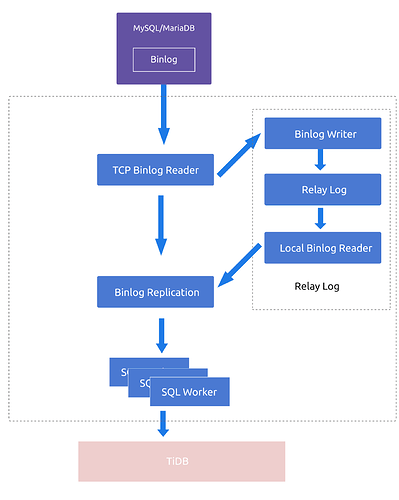 - 上游 MySQL/MariaDB 从本地读取 binlog 数据并通过网络进行发送。上游 MySQL/MariaDB 负载无异常时,该子流程通常不会成为瓶颈。
