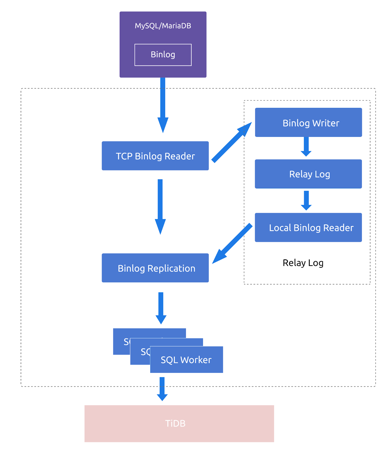 - binlog 数据通过网络从 MySQL/MariaDB 所在机器传输到 DM-worker 所在机器。该子流程主要由 DM-worker 与上游 MySQL/MariaDB 的网络连通情况决定。